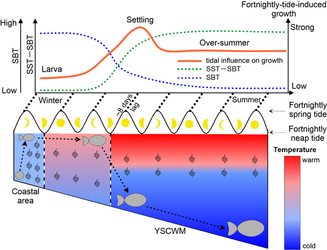 5月31日,国际权威海洋学杂志Journalof Geophysical Research: Oceans 发表了中国海洋大学渔业海洋学实验室李建超副教授关于潮流作用影响黄海太平洋鳕幼鱼生长的最新研究成果“Tidally induced temporal variations in growth of young-of-the-year Pacific cod in the Yellow Sea”。该研究通过多学科交叉的研究方法,探究了潮流对鱼类生长和黄海生态系统的重要作用。