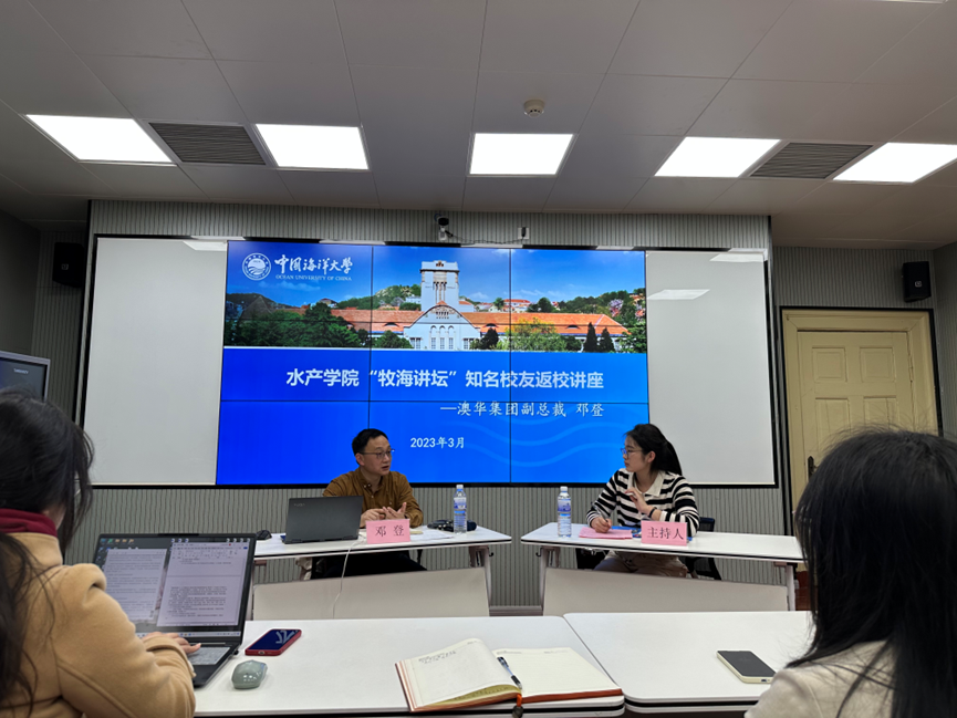 为充分发挥优秀校友榜样力量,强化校友导航育人功能,搭建在校师生与校友交流平台,3月20日,水产学院“牧海讲坛”之知名校友返校讲座开讲。本次活动邀请到我校2006届水产动物营养与饲料学专业博士毕业生、现任澳华集团副总裁的邓登先生,学院党委副书记王伟莉、辅导员王世晨,以及50余位本科生、研究生代表现场参加,部分2022级本科生以腾讯会议的方式参加讲座。