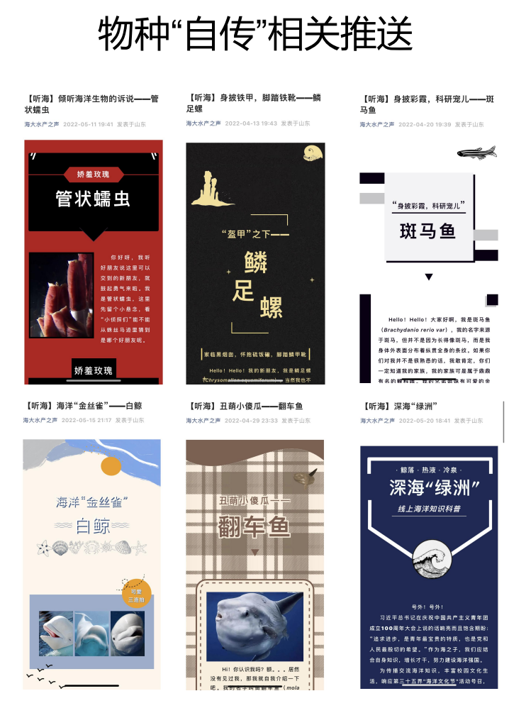 413日至515日,发布“物种自传”系列推送,通过查阅文献、借鉴纪录片等方法,以“我(们)在海里的一天\\生”为主题,以模仿海洋生物自述的方法,介绍具有科研价值或稀奇的海洋物种生活状态;以有趣的口吻,介绍硬核的专业知识。同时,在推送末增加问答环节,开放投稿通道。营造海洋文化节的氛围,宣传海洋文化,拓宽学生的海洋生物的知识面。