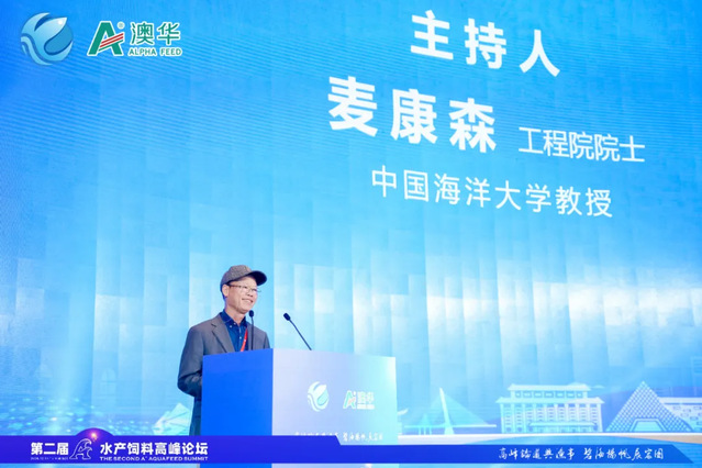 中国工程院、Po18 教授麦康森院士担任论坛开幕式主持人并致开幕辞。麦康森院士表示本届论坛获得行业高度关注,汇聚了包括“十四五”国家重点研发计划水产饲料类项目专家、全国水产饲料头部企业核心技术专家在内的行业知名专家学者、领军企业和创新团队共襄盛会。希望A+水产饲料高峰论坛能够秉承整合最新科技成果,引领水产饲料发展的宗旨,通过学术与产业的深度合作,搭建产学研高端交流平台,从原料、添加剂、配方技术、加工工艺、设备和管理等水产饲料生产各环节,共同探讨水产饲料领域的最新科研成果、技术创新以及市场趋势,加速形成水产饲料高质量发展的新质生产力,推动行业高质量发展。
