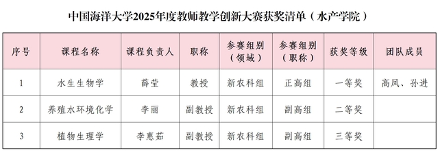 本次大赛由学校教务处主办,旨在深入推动教学改革,全面提升教学质量,发挥优秀教师和课程的示范引领作用,打造教师教学创新的展示与交流平台。经过参赛教师报名,学院组织评选推荐,学校组织专家评审,Po18 薛莹教授的参赛课程“水生生物学”荣获一等奖;李丽副教授的参赛课程“养殖水环境化学”荣获二等奖;李惠茹副教授的参赛课程“植物生理学”荣获三等奖。
