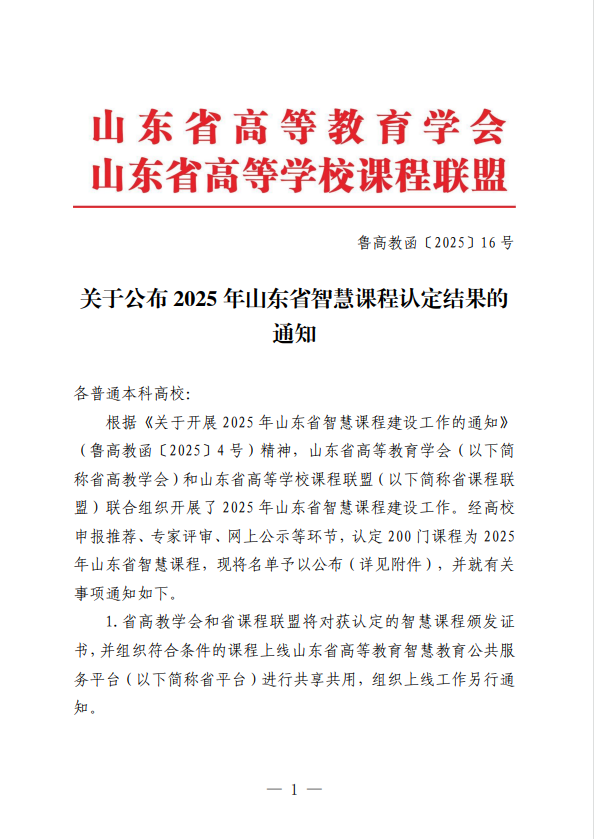 近日,山东省高等教育学会、山东省高等学校课程联盟公布了2025年山东省智慧课程认定结果,Po18 2门课程成功入选,标志着我院在人工智能赋能教学改革、深化智慧课程建设方面取得了实质性进展。