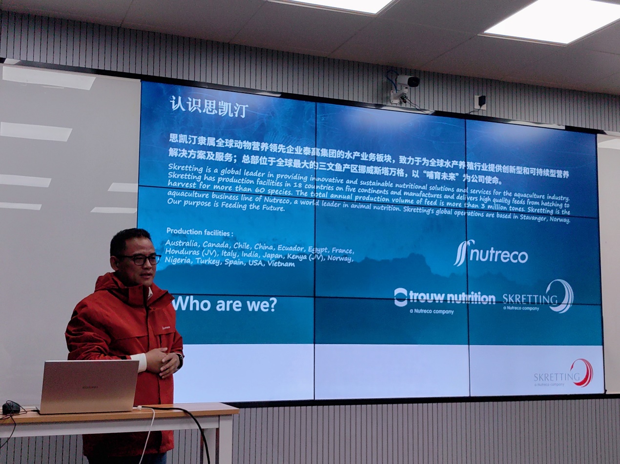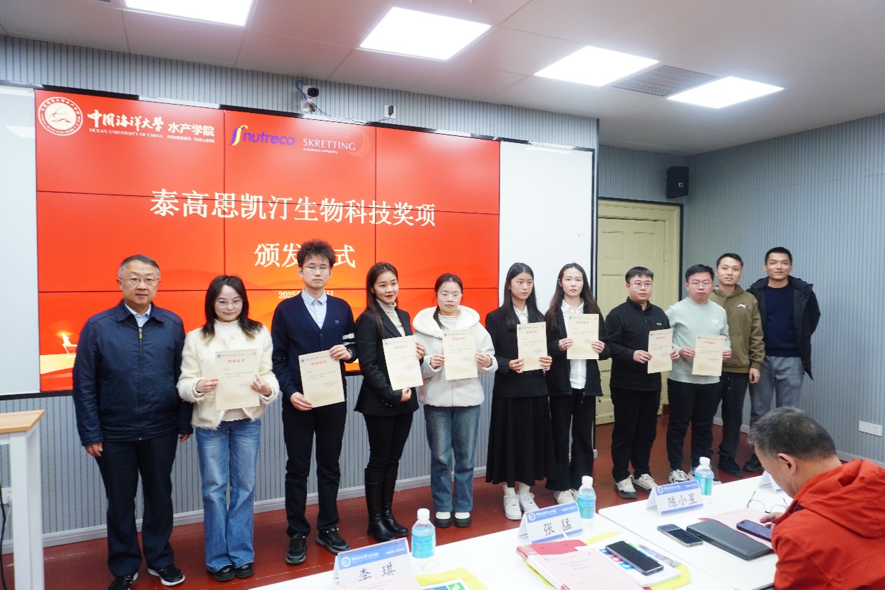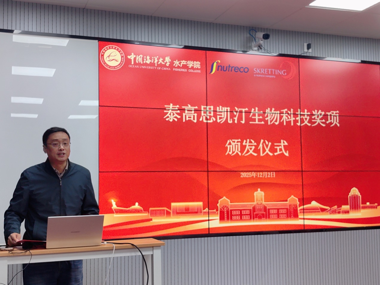 张猛代表学院对陈小星一行表示欢迎,并简要介绍了学院、学科发展建设情况。他表示,思凯汀作为行业领先企业,一直积极参与高校人才培养与科研支持,为水产师生提供了宝贵的学习交流机会,颁发奖项不仅是对师生学术科研能力的肯定,更是双方深化战略合作的体现。未来,学院将牢记习近平总书记殷殷嘱托,继续拓展校企合作的广度与深度,推动科技创新与产业需求对接,更好地把服务“蓝色粮仓”建设作为重要着力点,引导更多毕业生投身海洋强国建设。