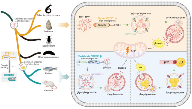 研究解析了 STBD1starch-binding domain-containing protein 1)的结构演化奥秘。该蛋白中的 CBM20carbohydrate-binding module 20)是糖原结合的关键功能区域 —— 在脊椎动物中,CBM20 结构域位于蛋白 C 端,而牡蛎的 CBM20 结构域却 反向定位于 N 通过蛋白结构建模、分子对接及功能验证实验,团队证实:这种 N 端定位的独特结构能显著增强 STBD1 与糖原的结合能力,并通过与自噬相关蛋白 GABARAPL2 的互作,高效介导糖原向自噬体的转运与降解,从而帮助牡蛎在饥饿胁迫下快速动员能量储备,维持生命活动。这一发现首次阐明了 结构微进化驱动代谢功能适应的规律,完善了自噬通路 结构 - 功能关联的理论体系