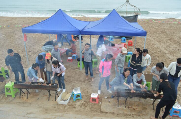 来到仰口,大家先在沙滩里竖起大伞,铺好桌布,架起炉具,升起炭火。有条不紊的进行着一切准备工作。