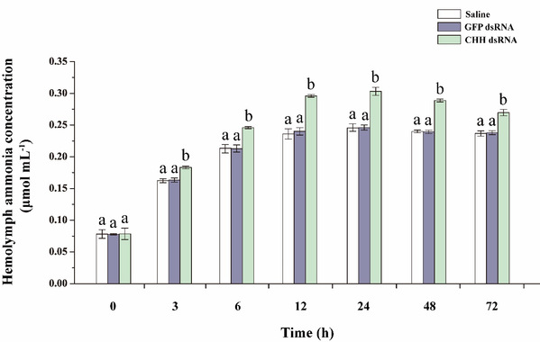 图3:CHH-RNAi对氨氮胁迫下凡纳滨对虾血淋巴氨浓度的影响