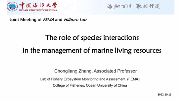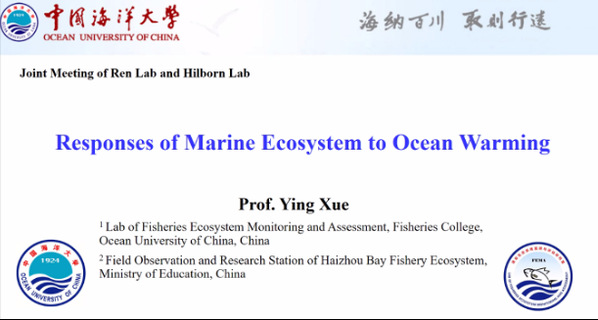 会议期间,基于渔业生态系统监测与评估领域的工作积累,薛莹教授和张崇良副教授以口头汇报的形式,对全球变暖的渔业生态系统响应、近海渔业资源分布研究进展和基于生态系统的渔业管理策略评估等主题进行了深入交流和讨论。