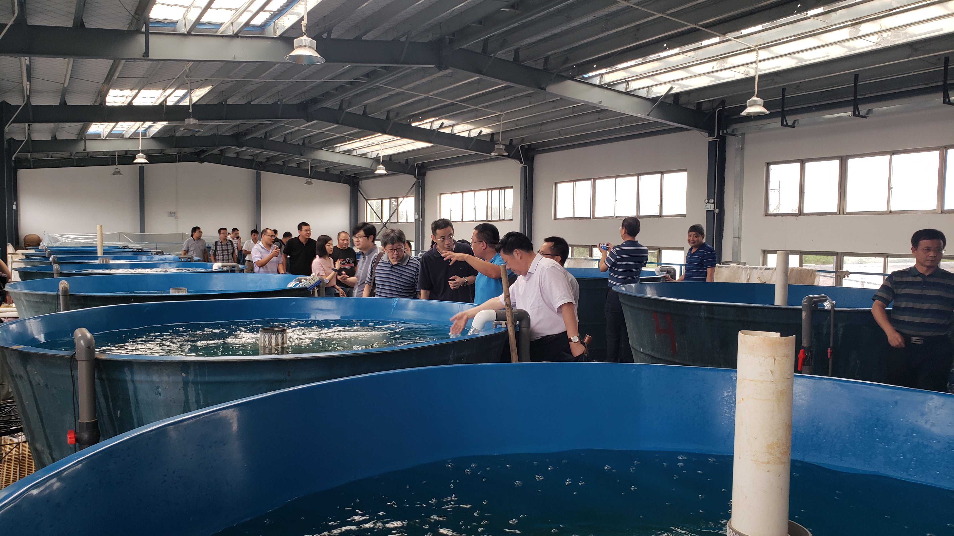 图2 与会人员考察河口渔业研究所循环水养殖车间 考察的第二站是广东强竞农业集团总部,副总裁刘红兵介绍了集团公司目前的工作状态及疫情期间的产品营销情况、集团产业园建设进展,并与专家进行了深入交流。该集团公司拟在海鲈产品流通、加工和贸易等继续发挥市场引领作用。