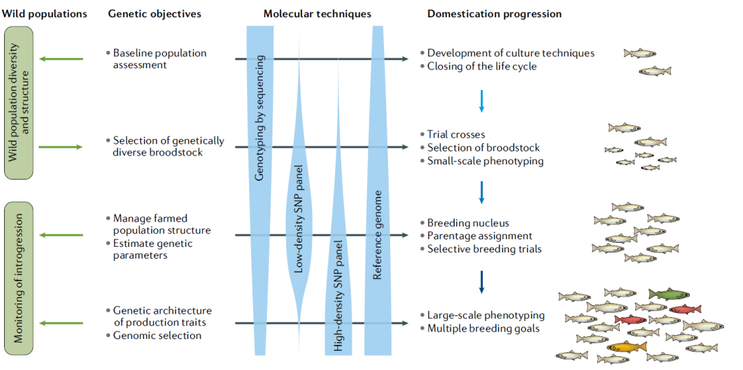 随着测序技术的发展,单个实验室已能进行目标物种的基因组测序,不再需要各实验室在人力和财力上的协调。大西洋鲑成为了水产养殖品种中第一个获得参考基因组的物种。然而,多个基因组组装(群体或品系特异性组装)间的标准化和协调,以及基因组功能注释,仍需通过国际协作和团队主导的项目来攻克。 基因分型是基因组工具辅助物种驯化和选择育种的重要环节。许多高价值的水产养殖品种中已经开发了SNP芯片平台。包括限制位点DNA测序及其衍生技术在内的基因分型测序(genotyping by sequencing)技术,都可在无参考基因组和低成本的情况下,获得该物种中的SNP数据,目前已应用于多个物种。 四、基因组在物种驯化中的应用 构建高度遗传多样性的基础群体和良好的管理系统,是驯化和选种育种体系的重要基础。亲鱼管理不善和配种不当会导致近交衰退(inbreeding depression),造成养殖群体的适应性下降,对压力和疾病敏感性增加,最终造成生产力下降。基因组工具可针对性地应用于水生动物驯化和选种的各个阶段,并对每个阶段进行优化。 应用基因组促进新物种驯化的一个很好例子是金赤鲷。迅速获得的从头组装基因组图谱、转录组、基因分型,以及遗传多样性和遗传参数评估等方法,被用于指导基础群体的选择、驯化过程中遗传多样性的维持和生产性状的生物学研究。与之相似的,在与大西洋鲑联合饲养的清洁鱼(球状濑鱼和圆鳍鱼,它们能将大西洋鲑身上的海虱清理掉)中的应用,大大加速了对圆鳍鱼科的基因组辅助驯化和育种。这些案例都是基因组技术得到快速应用的早期例子,可以从一开始就被用于指导物种的驯化和基因改良。