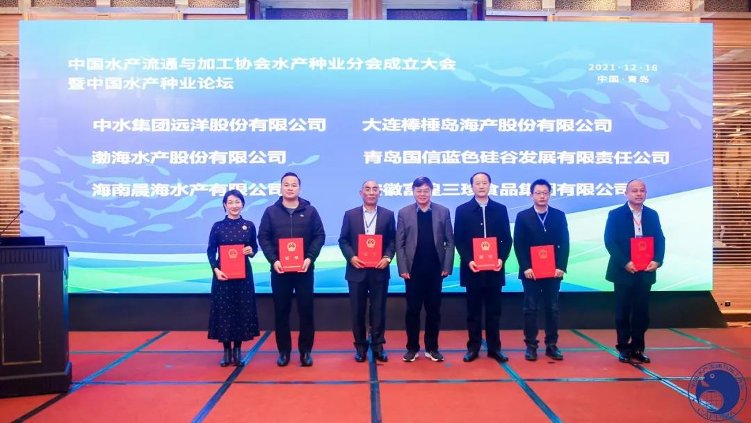 桂建芳院士为分会副会长中水集团远洋股份有限公司、渤海水产股份有限公司、海南晨海水产有限公司、大连棒棰岛海产股份有限公司、青岛国信蓝色硅谷发展有限责任公司、安徽富煌三珍食品集团有限公司颁发证书;