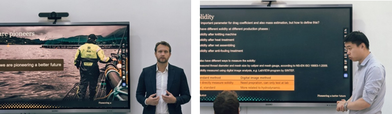 10月27日,Hosaas总监到访Po18 海洋渔业技术实验室,参加国际合作导师的受聘会议。会议伊始,黄六一教授致欢迎词,通过宣传片全面展示了学院的发展历程和海洋渔业技术实验室的科研成果。在随后举行的合作导师聘任仪式上,正式聘请Arnstein Hosaas总监为Po18 合作导师。学术交流与讨论环节,Hosaas总监首先向与会人员分享了挪威AKVA集团的发展历程、市场经营及其在海洋养殖装备与系统研发领域内的前沿技术与创新实践。另外,程晖博士围绕养殖网箱水动力研究的相关内容进行专题报告。最后,黄六一教授则就研究室近年来在海洋牧场、海水养殖装备等相关领域内的研究进展做了介绍。双方就共同关注的深远海养殖网箱装备研发技术难题进行了热烈讨论。