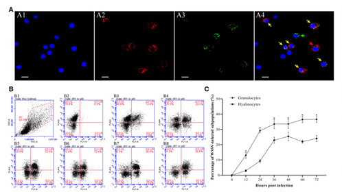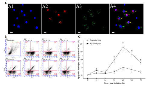 血细胞在对虾免疫系统中发挥着重要作用,白斑综合征病毒(WSSV)感染可诱导对虾血细胞发生凋亡,但目前尚未有研究阐明对虾血细胞不同亚群对WSSV侵染的凋亡应答差异。基于此,本文分别研究了中国对虾全血细胞和血细胞亚群的凋亡动态及病毒增殖特征。结果显示,在WSSV感染期间血细胞凋亡率发生了明显的变化,在感染后48小时达到22.2±3.0%的峰值;凋亡相关基因在病毒感染期间也呈现差异表达特性。在WSSV感染24小时后,病毒受感血细胞比例及血细胞中WSSV拷贝数也呈现快速增加,并维持在较高水平。免疫双荧光检测分析显示,在WSSV感染早期,病毒阴性血细胞凋亡率明显高于病毒阳性血细胞;而在感染中期和后期则明显低于病毒阳性细胞,这种差异似乎是WSSV在不同感染阶段破坏宿主免疫系统和促进病毒传播的重要途径。进一步研究发现,颗粒细胞密度在WSSV感染后率先显著下降,其凋亡率在病毒感染过程中也始终显著高于透明细胞,表明颗粒细胞对WSSV的响应更迅速并能够对病毒产生更为剧烈的凋亡应答。此外,在颗粒细胞中检测到了更高的WSSV病毒载量,表明与透明细胞相比,颗粒细胞似乎更易受到WSSV侵染,这可能是其对WSSV应答剧烈的原因之一。研究结果表明,对虾血细胞的凋亡反应受WSSV感染进程的显著影响,同时颗粒细胞和透明细胞对WSSV的差异凋亡响应反映了血细胞亚群抗病毒机制的差异,这将进一步加深对对虾血细胞亚群免疫功能特征差异的理解。