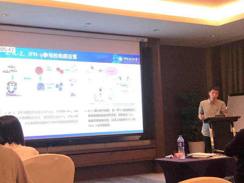 会议期间,战文斌一行与参会专家、各高校代表、各企业代表在鱼用疫苗研发与应用、有效防控水产养殖病害、推动科技成果转化等方面进行深入交流。启明星学术论坛环节中,王泓翔以《牙鲆IL-2IFN-γ的免疫佐剂效应研究》为题作精彩报告并获大会研究生优秀论文一等奖。报告从鱼用疫苗佐剂研究背景入手,由浅入深揭示IL-2IFN-γ参与免疫应答机理,阐明IL-2表达特性,并对IFNγ和IL-2进行生物学功能验证和佐剂效果评估。与会同学就上述内容在生产中的实际应用进行热烈探讨。