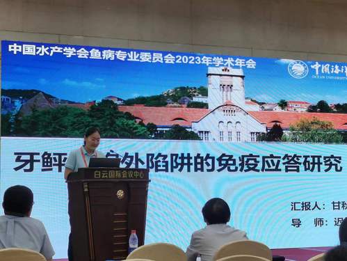 博士生甘秋洁做了《牙鲆细胞外陷阱的免疫应答研究》的学术专题报告。