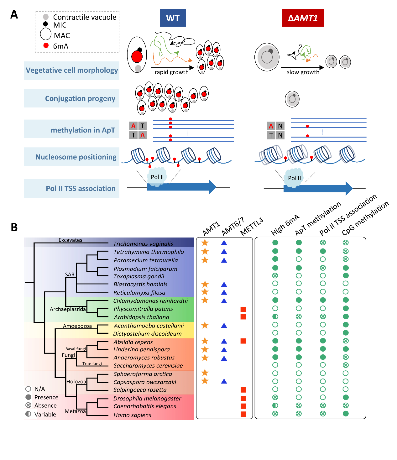 3)AMT1属于甲基化酶MT-A70蛋白家族的一个独特分支:AMT1及其同源蛋白主要分布在原生生物及早期分化真菌中,与高6mA含量、ApT特异序列、RNA聚合酶Pol II转录高度相关;与之形成对比的是,上述特征在动物、植物以及高等真菌中均缺失,这些物种中通常以另一个MT-A70蛋白家族METTL4的同源蛋白作为6mA甲基化酶。该研究显示,二者在功能上拮抗与互补的特点,可能是推动真核生物进化的不同驱动因素。