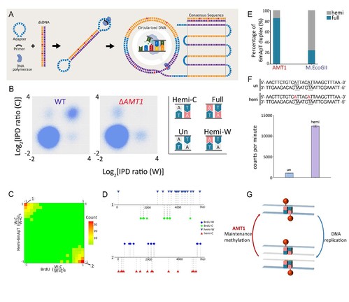 图1. 6mA以半保留的方式进行遗传。(A)SMRT-CCS测序原理示意图。(B)AMT1敲除后全甲基化(Full)位点消失。(C)半甲基化的6mA(Hemi-6mA)位点与BrdU标记的新生链互补分布,表明Hemi-6mA分布在母本链上。(D)半甲基化的6mA(Hemi-6mA)位点与BrdU标记的新生链互补分布代表性位点示意图。(E)AMT1倾向于将位点催化成全甲基化状态。(F)体外酶活实验显示AMT1对半甲基化底物有明显的偏好性。(G)6mA半保留遗传的模式图。