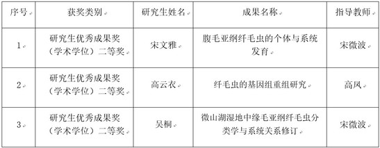 此次评选中,本研究室教师指导的研究生有3人获研究生优秀成果奖(学术学位)二等奖 ”,彰显了原生动物学团队较高的人才培养水平。
