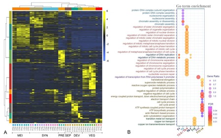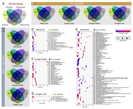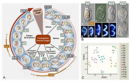 为了揭示参与有性生殖过程的基因和蛋白,本研究通过对扇形游仆虫 14 个生活史阶段的转录组分析,解析出超过 26,000 个在不同阶段特异表达的基因,涉及 DNA 复制、转录、翻译、有丝分裂、减数分裂、细胞核分化、基因组重排等多个重要生物学过程。通过物种间的比较,显示出基因表达高度的物种特异性,暗示了纤毛虫分子层面的高度多样性。通过定量蛋白组学分析确定了300多个在有性生殖和新大核发育过程中发挥功能的重要蛋白,包括 Dicer-likeHsp90、核糖体相关蛋白、泛素相关蛋白、非同源末端连接蛋白、RNA 聚合酶 II 和转录延伸因子等,参与细胞分裂、基因表达调控等重要过程。