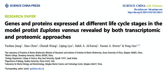 近日,原生动物学团队高凤课题组在Science China Life Sciences在线发表了题为“Genes and Proteins Expressed at Different Life Cycle Stages in the Model Protist Euplotes vannus Revealed by Both Transcriptomic and Proteomic Approaches”的研究论文。该研究综合利用转录组和蛋白组数据全面解析了海洋纤毛虫(扇形游仆虫)整个生活史过程的基因和蛋白表达谱,揭示了大量有性生殖相关的新基因,为未来深入研究基因组重排和有性生殖相关的调控机制提供了新资讯。