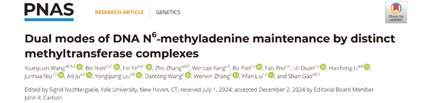 2025年1月,原生动物学研究室高珊课题组与南加州大学刘一凡课题组合作在PNAS杂志发表题为“Dual modes of DNA N6-methyladenine maintenance by distinct methyltransferase complexes”的研究成果。这项研究以单细胞真核生物-四膜虫为模式材料,首次发现了两种不同的6mA甲基化酶复合体,并阐明了它们在维持性甲基化过程中的协同作用。这一双重调控机制确保了DNA复制后6mA甲基化快速、准确的恢复。