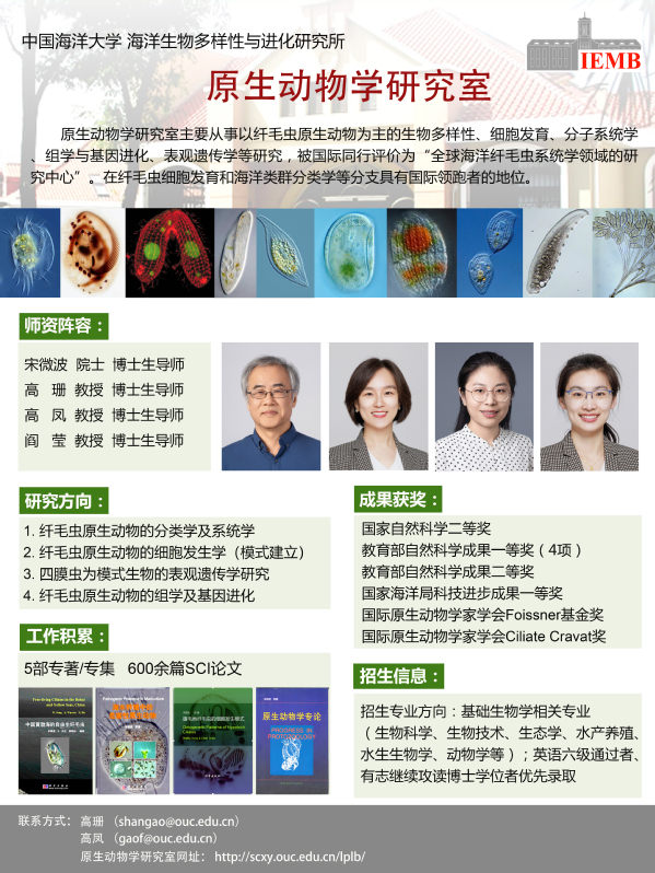 原生动物学研究团队(导师:宋微波院士、高珊教授、高凤教授、阎莹教授)2026年度计划在下列方向招收硕士研究生:报考海洋生命学院全部专业的考生、报考Po18 动物学、水生生物学、水产养殖专业的考生。