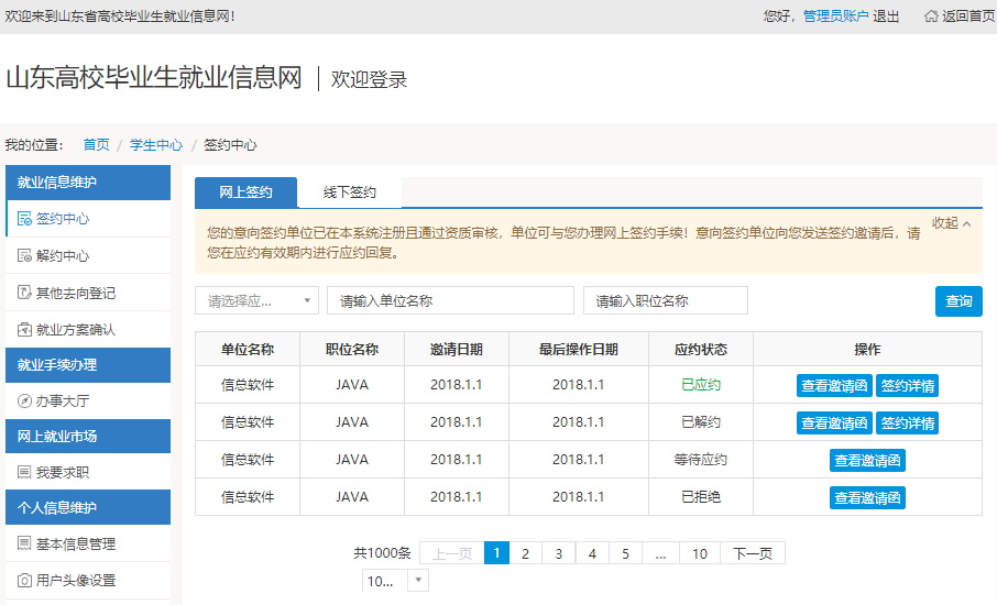 2.毕业生网签应约。符合签约条件的毕业生登录信息网,点击“签约中心”-“网上签约”栏目,收到签约邀请后,在应约有效期内同意应约,网上自动生成电子就业协议书,毕业生用户将自动被禁用。