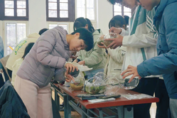 北部的分区是由水族社组织的制作生态瓶的摊位。水族社免费提供玻璃瓶、水草、砂砾和培养土,为同学们讲解生态瓶制作和藻类的知识,并且鼓励同学们根据自己的喜好进行自主创作,小小的玻璃瓶里透露出蓬勃的生机。