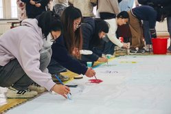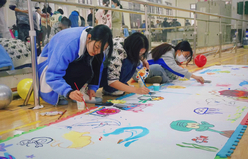 西部的分区是海洋生物绘画活动区域。主办方为在场同学提供颜料画笔,绘画罩衣若干,鼓励同学们在两张纸拼成的1m×6m的画纸上尽情描绘自己对于深海的想象。不多时,美人鱼公主、海绵宝宝、派大星、小丑鱼等可爱俏皮的海洋精灵跃然纸上,好似在讲述着创作者对海洋的憧憬和热爱。