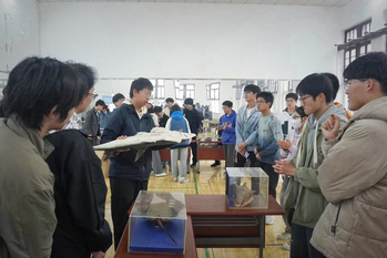 东部则陈列着一排海洋生物标本,其中有长长的密点裸胸鳝,带刺的唐冠螺,圆形的瓜螺,绿色的鲯鳅,还有中国鲎,圆犁头鳐和尖犁头鳐。其中,圆犁头鳐和尖犁头鳐是极危物种。水产学院2022级水产养殖学1班的康梓杉同学为围观的同学讲述这些海洋生物的相关知识,让同学们意识到保护海洋生物是每个水产学子肩上沉甸甸的责任。