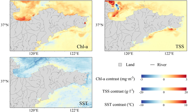 图4 台风利奇马对山东近海叶绿素a浓度、悬浮颗粒物浓度和海水表面温度的影响(到来后一周与来之前一周的差值)
