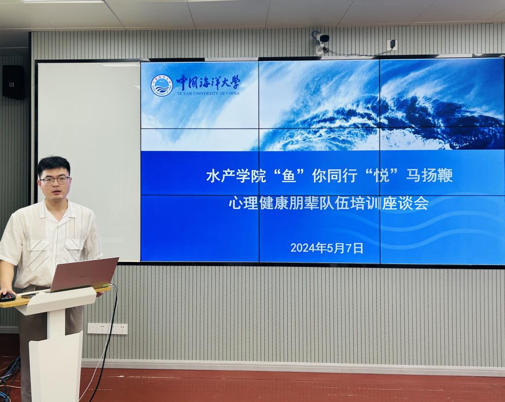 5月7日下午,水产学院举办“‘鱼’你并肩,‘悦’马扬鞭”心理健康朋辈队伍培训座谈会。会议由辅导员刘鹏主持,水产学院心理健康朋辈队伍参加会议。会上刘鹏向大家进一步明确了心理健康朋辈的重要作用与责任,并就日常工作和心理健康节相关活动的开展进行了动员和交流座谈,听取了朋辈队伍的意见和想法。最后刘鹏围绕大学生心理健康的识别与维护对心理健康朋辈队伍进行了系统培训。通过此次培训座谈会,朋辈队伍对自身工作定位有了更加清晰的认识,并切实掌握了心理健康识别和维护的基本技能,为学院心理健康教育工作能够落到实处提供了切实保障。