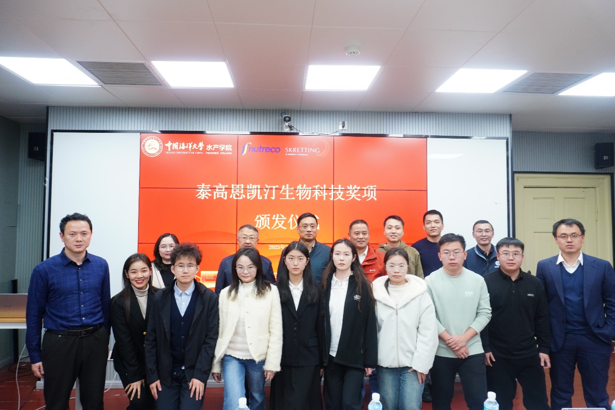 12月2日,“泰高思凯汀生物科技奖项”颁发仪式暨校友经验分享会在鱼山校区铭史楼302会议室举行。泰高思凯汀销售总监陈小星,水产学院党委书记张猛、名誉院长李琪、副院长万敏出席仪式。
