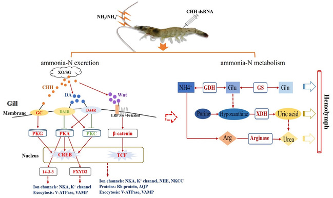 氨氮(NH3/NH4+)是养殖水环境中最常见的污染源和应激源之一,严重威胁水生动物的存活和生长,甲壳动物营底栖生活,如何适应底栖水中高浓度氨氮尚不明确。甲壳动物的氨解毒代谢方式主要依赖于氨排出,此外,还报道了谷氨酰胺、尿酸和尿素的存在,这表明甲壳动物体内存在复杂的氨氮生理代谢过程,但尚不清楚氨排出和代谢的神经内分泌调控过程。