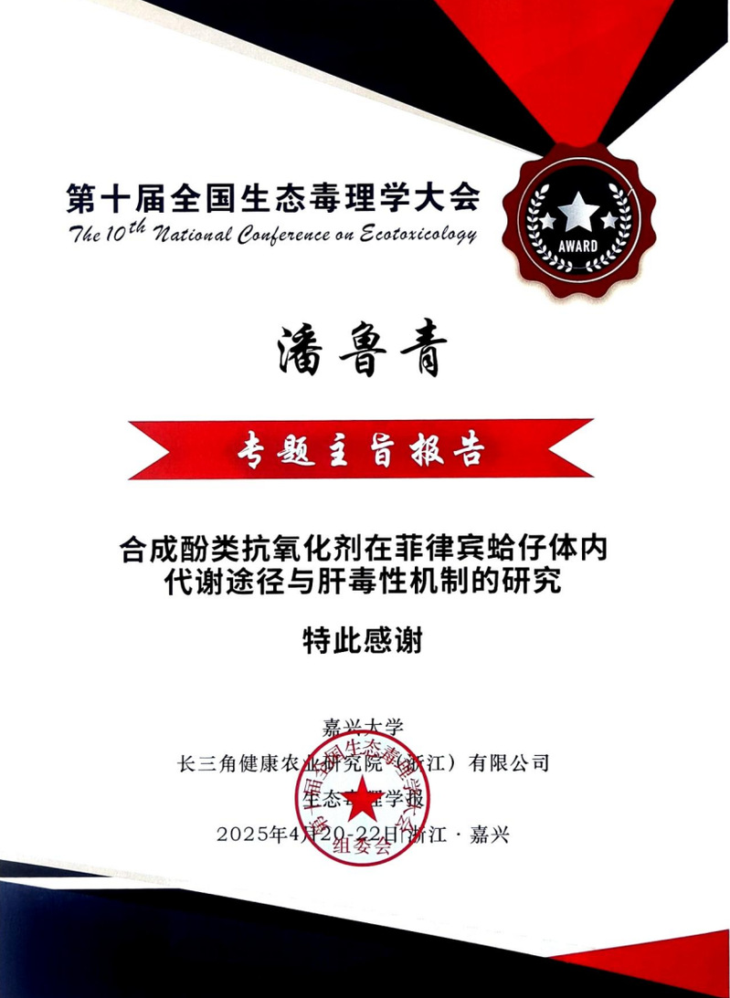 2025年4月20-22日“第十届全国生态毒理学大会”在浙江省嘉兴市隆重召开。本次盛会由嘉兴大学、长三角健康农业研究院(浙江)有限公司与生态毒理学报联合主办,汇聚了国内生态毒理学、环境毒理学、卫生毒理学等领域的权威专家、学者和青年科研工作者,围绕化学物质环境行为、毒理效应机制、生态健康风险评估等前沿议题展开深入研讨。研究室潘鲁青教授和苗晶晶副教授受邀在会议上作学术报告。
