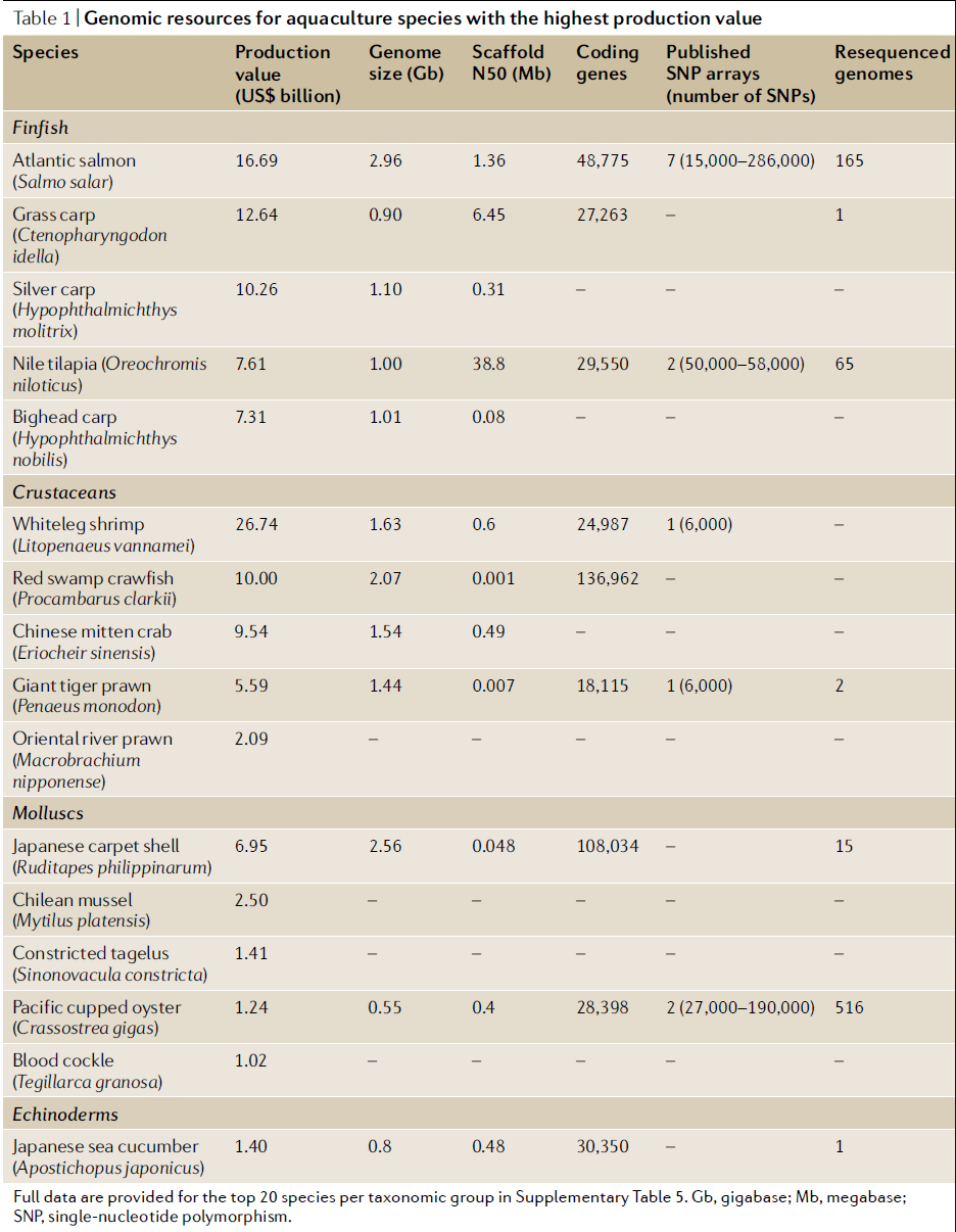 图1 物种首次被养殖或驯化时间 通过选择育种实现遗传改良,需要在驯化水平上不断改进,这反映了我们控制圈养动物的能力。虽然水产养殖物种的多样性对这一过程提出了挑战,但新的饲养技术将促进我们对生殖生物学和苗种培育的理解,有助于克服困难。 三、基因组工具的蓬勃发展 水产基因组资源普遍落后于畜禽基因组资源,尤其是在测序和参考基因组的组装上。一些高价值水产物种至今仍没有公开高质量参考基因组信息。这在某种程度上反映出非哺乳动物和非鸟类基因动物在基因组组装上面临挑战。水生生物基因组由于基因组复制事件,导致大量重复位点广泛分布(如鲑科、鲤科和鲟鱼目),以及高杂合度(如双壳类和甲壳类物种)。这些特征严重阻碍了使用短序列数据的基因组组装,导致基因组组装片段化。然而,正是这些基因组特征使得物种在养殖环境中具有适应能力和表型可塑性,有利于生产性状的遗传调控。 最新的测序技术,包括生产长reads的平台,如单分子实时测序(PacBio)、纳米孔测序(Nanopore)和Linked reads(10x Genomics),已被越来越多地用于水产养殖物种,改善基因组组装。当与长范围scaffolding技术(如Hi-C或光学图谱)相结合时,对高难度基因组进行高质量的连续组装将成为可能。如最近组装的黄鲈基因组,包含24条染色体大小的scaffolds,覆盖整个基因组的99%,N50为37.4Mb。所有主要水产物种都将从这种高质量组装中受益。目前已发布的水产养殖物种基因组信息如下表1所示。
