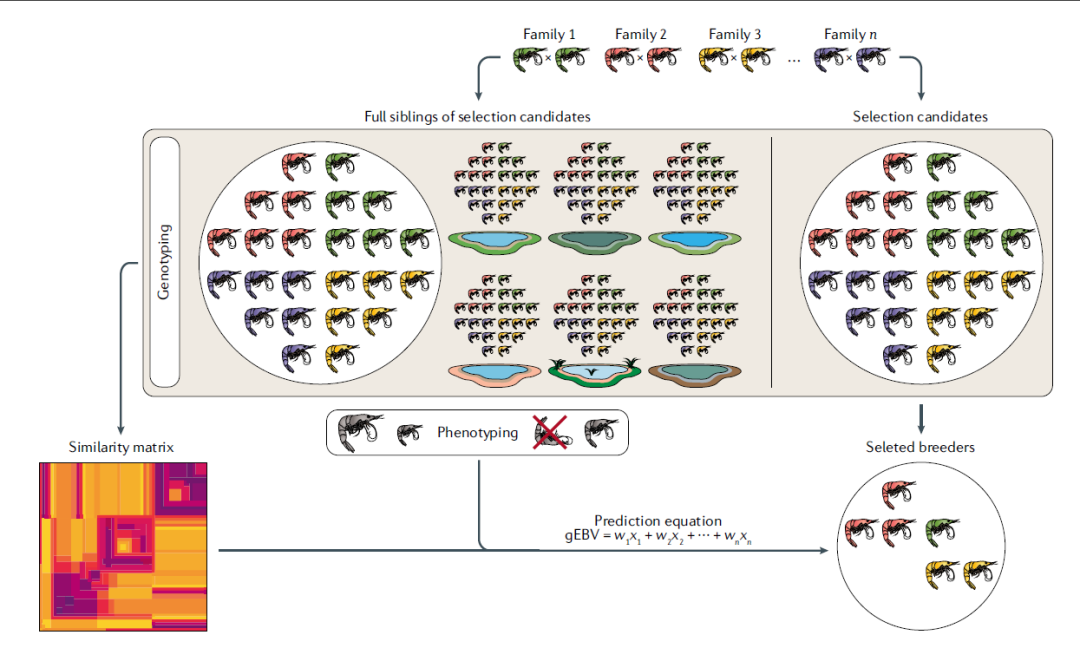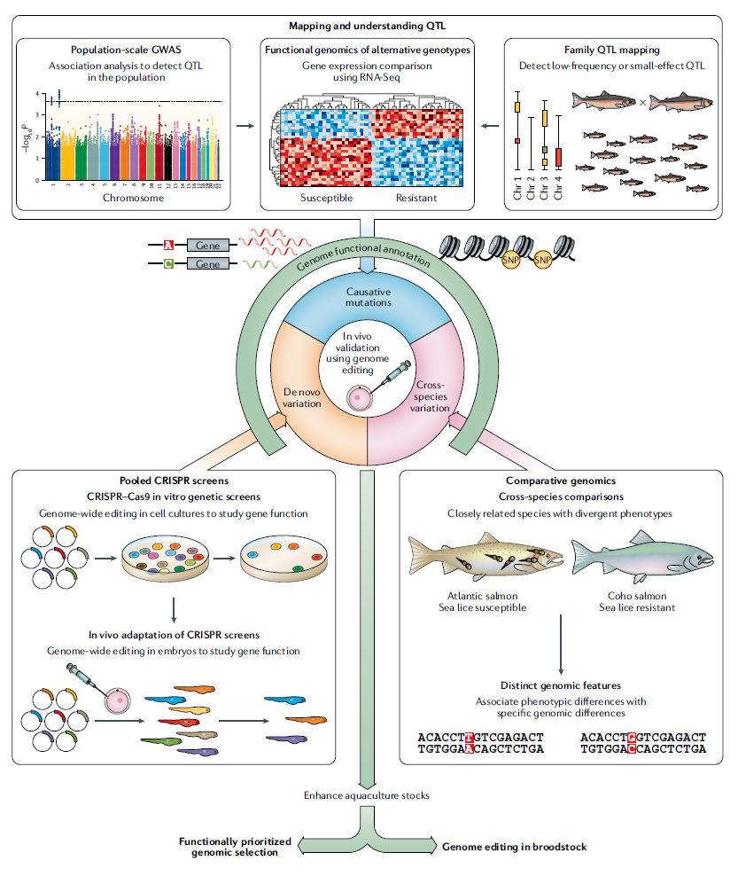 一、背景介绍 水产养殖对全球食物安全和经济稳定起着举足轻重的作用,且影响日益增大。全球90%以上的水产养殖分布在低收入和中等收入国家,保证了人类食物需求和经济增长,为联合国可持续发展目标做出巨大贡献。据联合国粮农组织(FAO)报道,2017年全球鱼贝类的年产量达到了1.726亿吨,其中水产养殖就占据了半壁江山。出于商业目的进行的海洋和淡水渔业捕捞给野生群体带来严重压力,使得渔业捕捞变得不可持续。与之相比,水产养殖业却日渐蓬勃。在野生捕捞和陆地农田开发有限情况下,水产养殖产品是非常实惠且营养的动物蛋白来源。然而,水产养殖集约化带来的环境问题,例如对生境的破坏和传染病爆发,对养殖群体甚至野生种群的健康和福利造成了负面影响,这一影响还可能因气候变化而进一步恶化。 通过对生产性状进行遗传改良,选择育种能够提高生产效益、减少水产养殖带来的环境污染问题。与家畜和农作物相比,水产养殖品种丰富,目前养殖的鱼类、软体动物、甲壳类,水生无脊椎动物、两栖爬行类,共计543个品种。全球有70个水产养殖品种占据水产养殖产量的80%;而畜禽养殖中,猪、鸡和牛三个品种的产量就占到了全球肉类产品的80%;作物中,水稻、小米、玉米和土豆占到了全球农作物产量的三分之二。在这丰富多样的水产养殖品种中,有两个共同的关键特征,大大增强了它们的遗传改良潜力:第一,水产品经历人类驯化时间短,其种群内遗传多样性丰富;第二,水产品具有高繁殖力和体外受精特点。因此,育种方案设计也就更灵活,挑选的优良个体能推广到到养殖户中,不需要多个世代的繁殖就能提供足够数量的优良个体用于生产。联合国粮农组织在最近的报告中也强调,对尚未开发且具有遗传潜力的水生物种进行驯化和选择育种,是水产养殖发展中一个不可错失的机遇。从水产养殖育种体系中获得的高遗传增益来看,生产性状的累积和永久改进的具有很大潜力,如大西洋鲑鱼每个世代的生长速度能提高13%,远高于畜禽生长性状的育种改良。 基因组学工具对遗传改良可持续性发展具有巨大价值。现阶段,由于具备了可负担和使用基因组工具的可能,从指导基础群体的选育,到促进封闭商业育种体系的基因组选择,我们可以将其应用于驯化和遗传改良的全过程。此外,基因组学还可用于野生物种遗传资源的特征描述、利用和保护,为管理养殖群体和野生群体之间的交流提供参考。 本文对水产养殖品种中的驯化和遗传育种进行概述,主要说明基因组工具的定向应用如何加速不同环境和物种中的遗传改良,探索了新兴基因组和生物技术的前景,以期逐步改进水产养殖的育种和生产。 二、水产养殖物种的驯化 本文将驯化定义为:从完全依赖野生种群变为完全在人类圈养下完成整个生命周期,并利用现代育种技术对生产性状(如生长和抗病性状)进行遗传改良的过程。从历史上看,在决定养殖哪些畜禽和水产品时,关键是选择特定环境下可繁殖的品种。例如,被驯化的物种往往表现出行为可塑性,这使得它们能够适应圈养环境。家畜和水产养殖物种存在一个关键区别,早在对饲养种群进行充分管理的数千年前,家畜的驯化与全球人类迁移已经在同步发生的,现代家畜已经经历过多样性下降的遗传瓶颈。相比之下,在水产养殖物种中,驯化和选择育种之间的时间间隔要短得多,大多数情况下两者是同时发生的。因此,基因组工具可以从一开始就用于优化和加速这两个进程,帮助我们深入理解这对物种基因组和生理的影响。