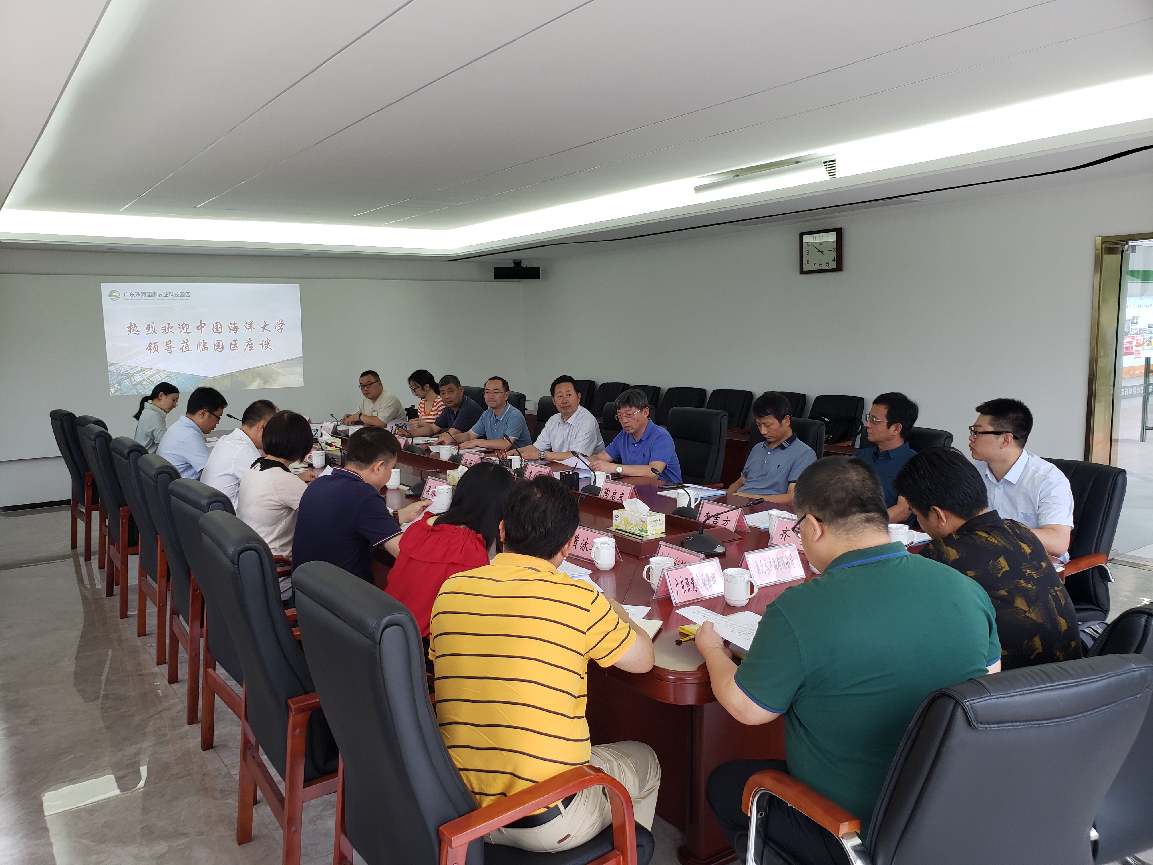黄主任介绍园区概况 随后,与会代表展开热烈讨论,生态园管委会代表就海鲈一、二、三产业融合发展、企业资源整合、科研成果产业转化、尾水排放治理等问题展开了充分讨论;企业代表特别关注海鲈产品源头质量控制、产品研发、苗种问题、病害问题、全产业链设计、宣传推广等问题。 听了各位代表的讨论后,黄进副主任讲到,双方要细化合作方案,明确政府、企业、海水鱼体系的目标和职责,在生态园原有的建设规划方案的基础上进行优化;加强海鲈标准化体系的建设,搭建海鲈交易平台,增加白蕉海鲈在市场上的话语权;黄主任建议双方合作的启动仪式同10月份广东科创中心珠海分中心挂牌仪式一同举行。接着,温教授表示,将向海水鱼体系首席汇报在合作方案中增加海鲈标准体系建设和海鲈交易平台建设的内容;在苗种问题上,需要从江浙一带亲鱼质量这一源头着手进行改善,由于海鲈繁殖特点,珠海繁殖时间晚于北方,在时间上没有竞争优势;病害方面,很重要的因素是由于苗种质量下降导致鱼体自身抵抗能力降低,进而容易发病。