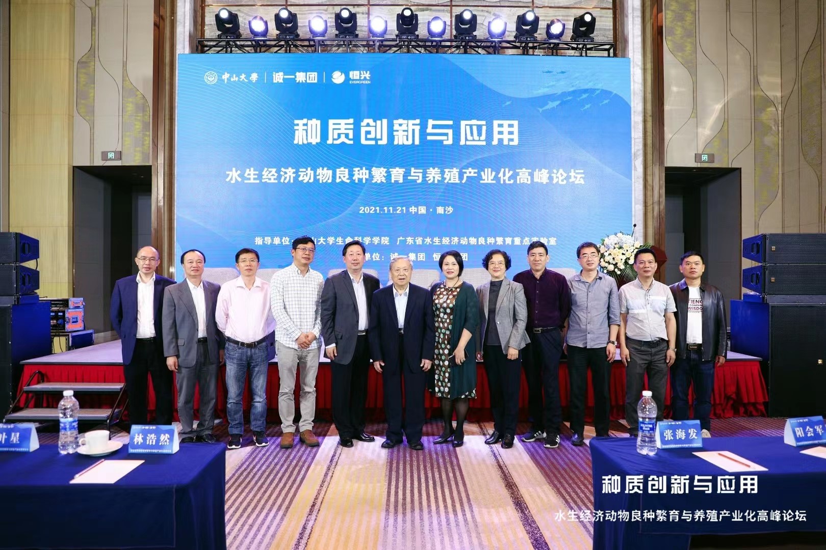 11月21日,由中山大学广东省水生经济动物良种繁育重点实验室主办,广州市诚一水产科技有限公司、广东恒兴集团有限公司主办的“水产种质创新与应用”论坛,在广州市南沙区举行。实验室温海深教授和齐鑫副教授参加会议,中山大学教授张勇担任主持,珠江水产研究所研究员叶星作大会报告《鳜鲈良种培育及相关研究汇报》,广东海洋大学教授朱春华作大会报告《南方海水种业硅谷建设设想》报告,阳江职业技术学院教授陈兴汉介绍了《疣吻沙蚕(禾虫)种业创新及综合种养产业化进展》。中国工程院院士林浩然指出:我国是世界水产养殖大国,从2008年起养殖产量一直占世界养殖总产量的60%-70%,其中优良苗种起到了巨大的推动和促进作用。大力发展水产种业,开展种质创新与应用,对于保障水产养殖业的健康可持续发展、促进渔民增收、服务国家经济发展意义深远。广东在水产种业方面的成绩斐然,是全国水产种苗研发的风向标。 海南热带海洋学院水产与生命学院副院长黄海、广东省农业技术推广中心首席专家张海发、诚一集团董事长阳会军、恒兴集团副总裁刘付永忠、中国海洋大学水产学院副院长温海深、广东海洋大学水产学院院长李广丽、珠江水产研究所研究员谢骏出席“水产种业创新与养殖产业化”主题沙龙上进行了专业分享。温海深教授重点分享了我国海鲈种质资源、人工繁育、遗传育种研究的状况,以及今后的重点研发方向。